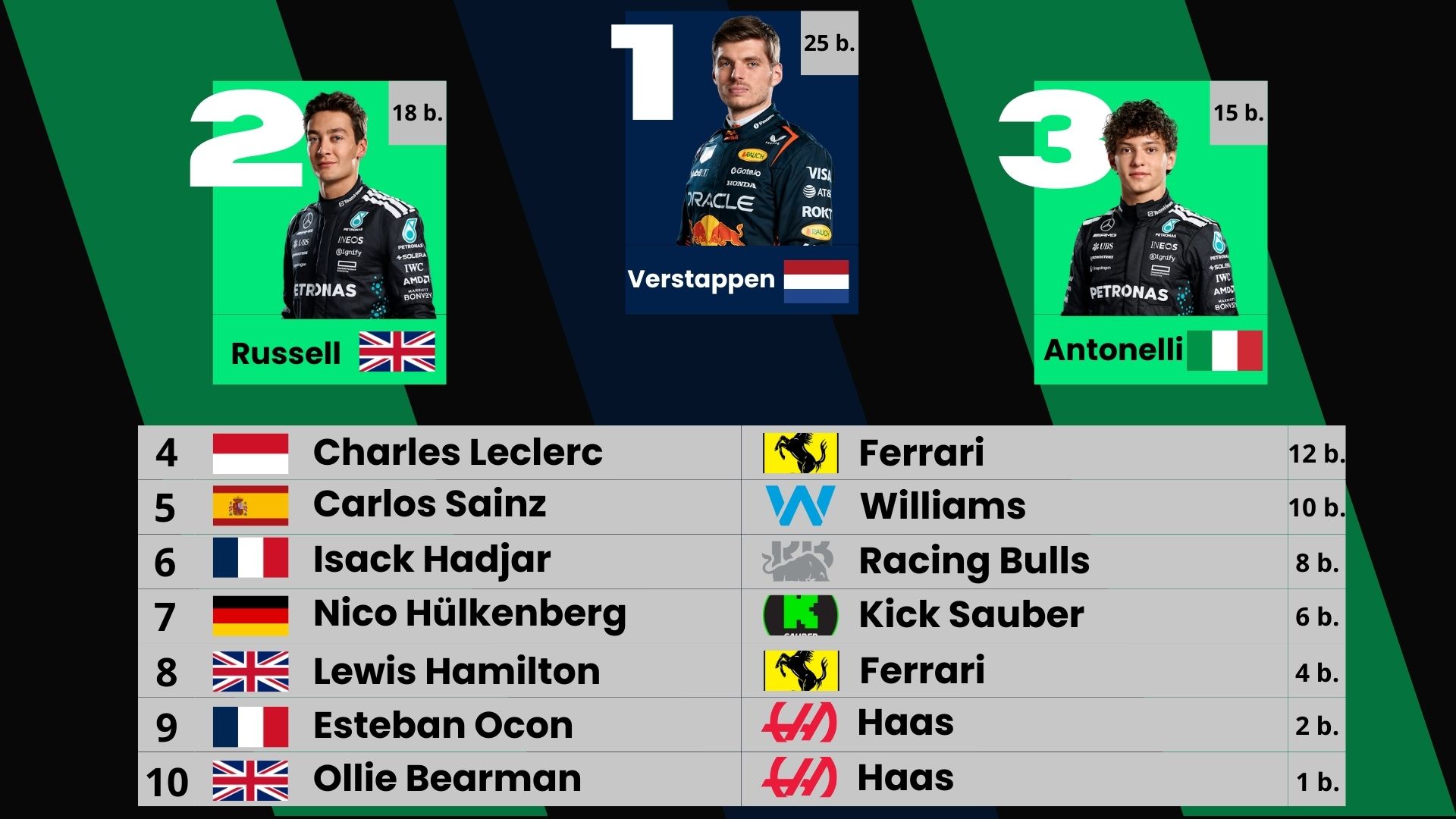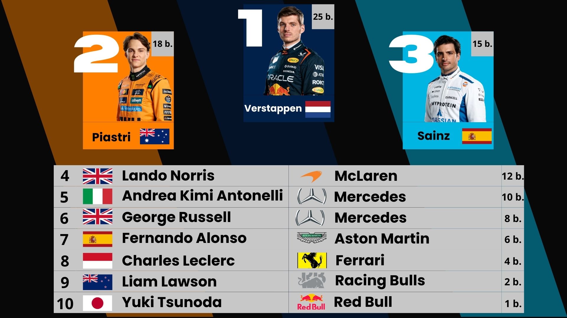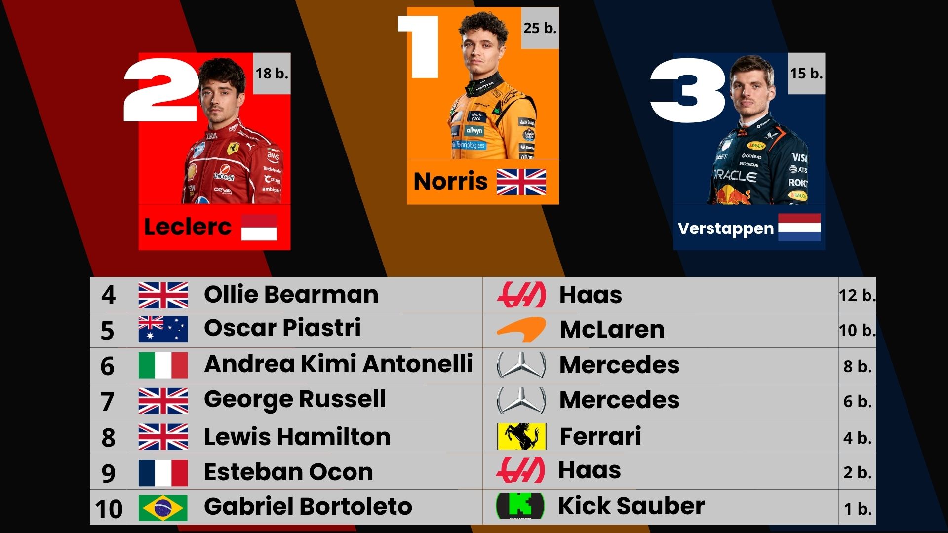 Výsledek: (pole position) pro Oscara Piastriho + dobré výchozí pozice, ale závodní strategie zklamala. Piastri skončil 2., Lando Norris dojel 4.