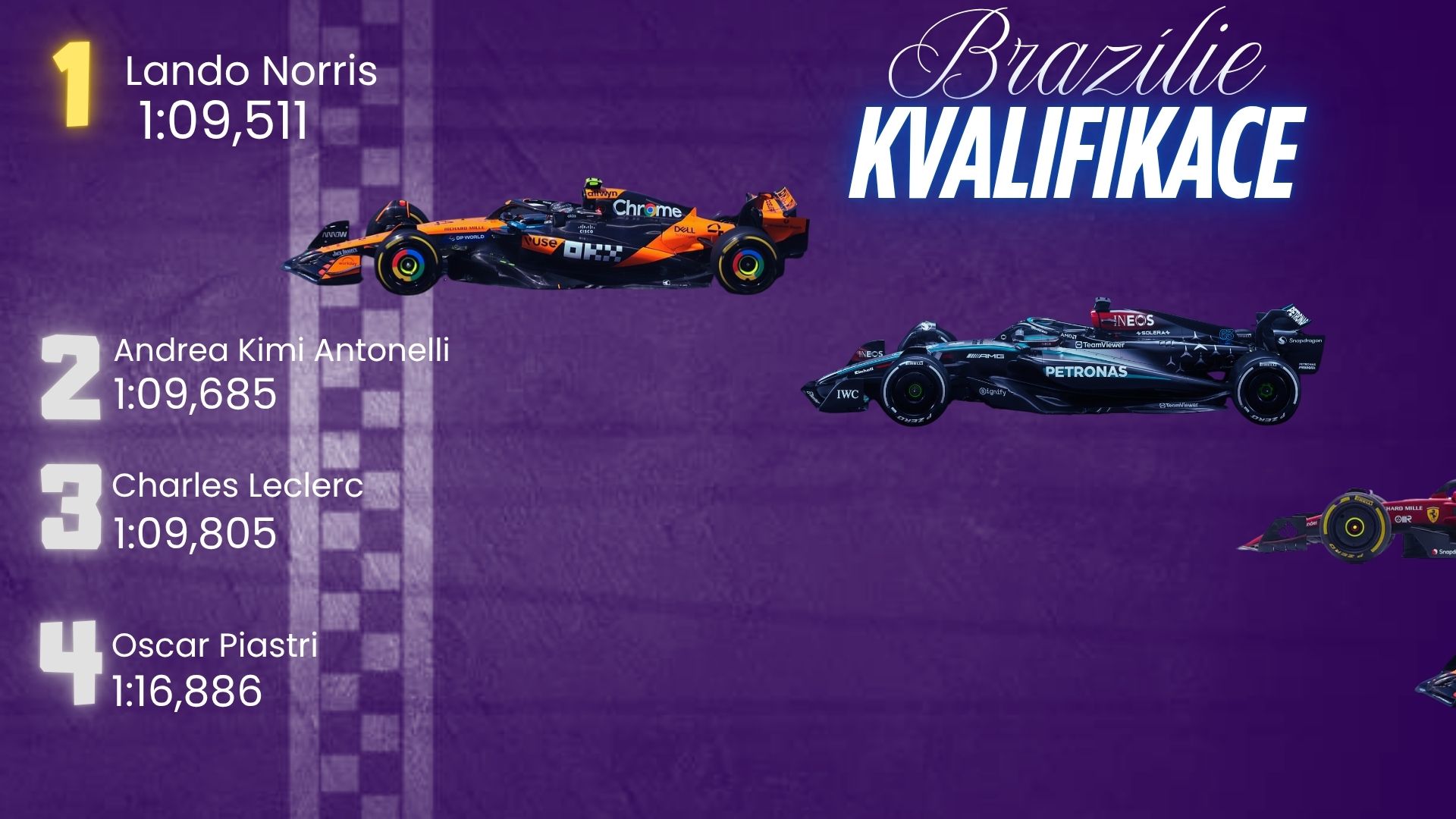 McLaren znovu potvrzuje roli lídra v závěru sezóny. Lando Norris zajel fantastické kolo a suverénně vybojoval pole position. Oscar Piastri skončil čtvrtý, jen o pár desetin za kolegou, takže tým má vynikající výchozí pozici pro neděli. Auto funguje skvěle v pomalých i středně rychlých zatáčkách, navíc stabilita na brzdách v Sao Paulu...