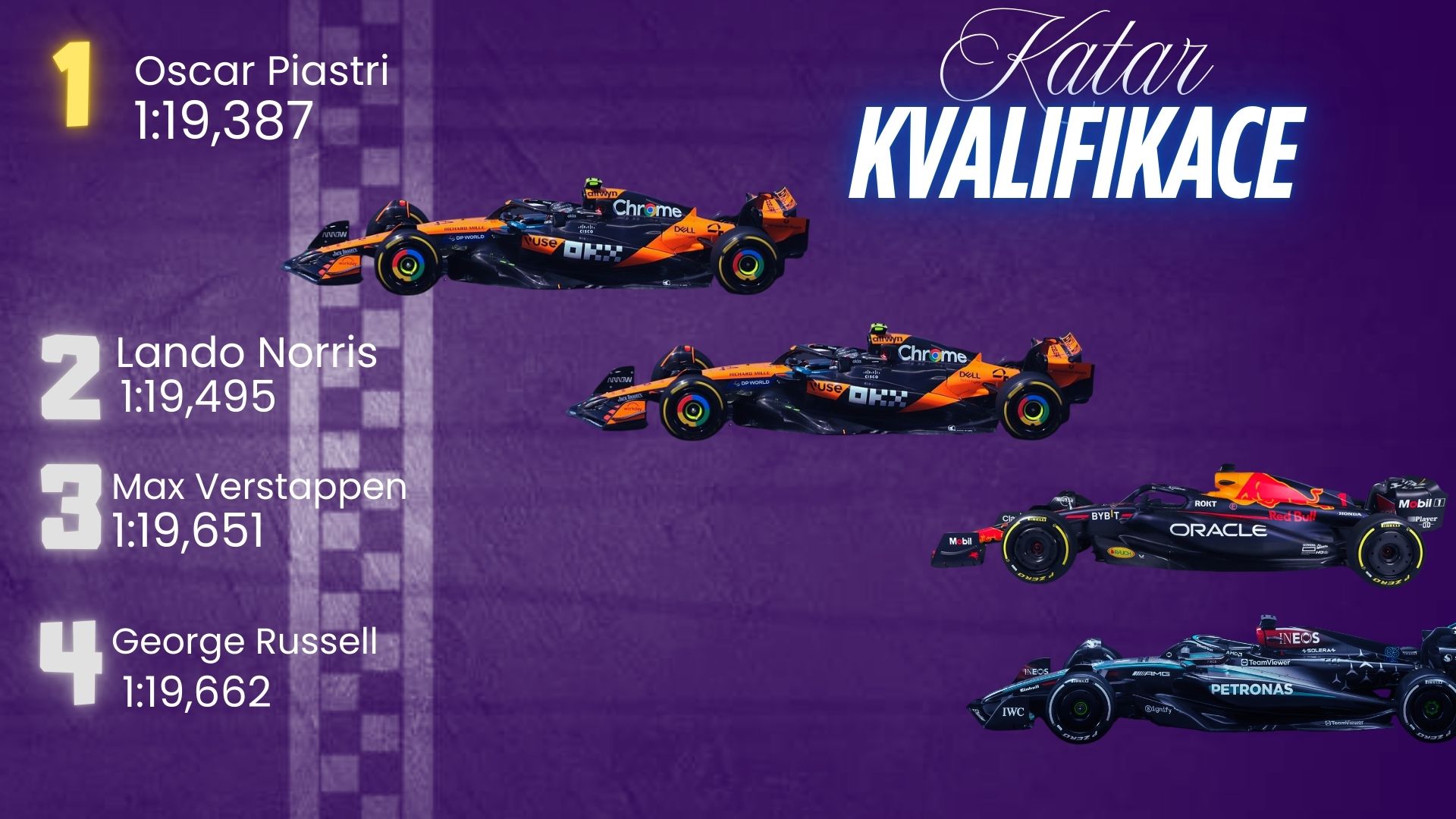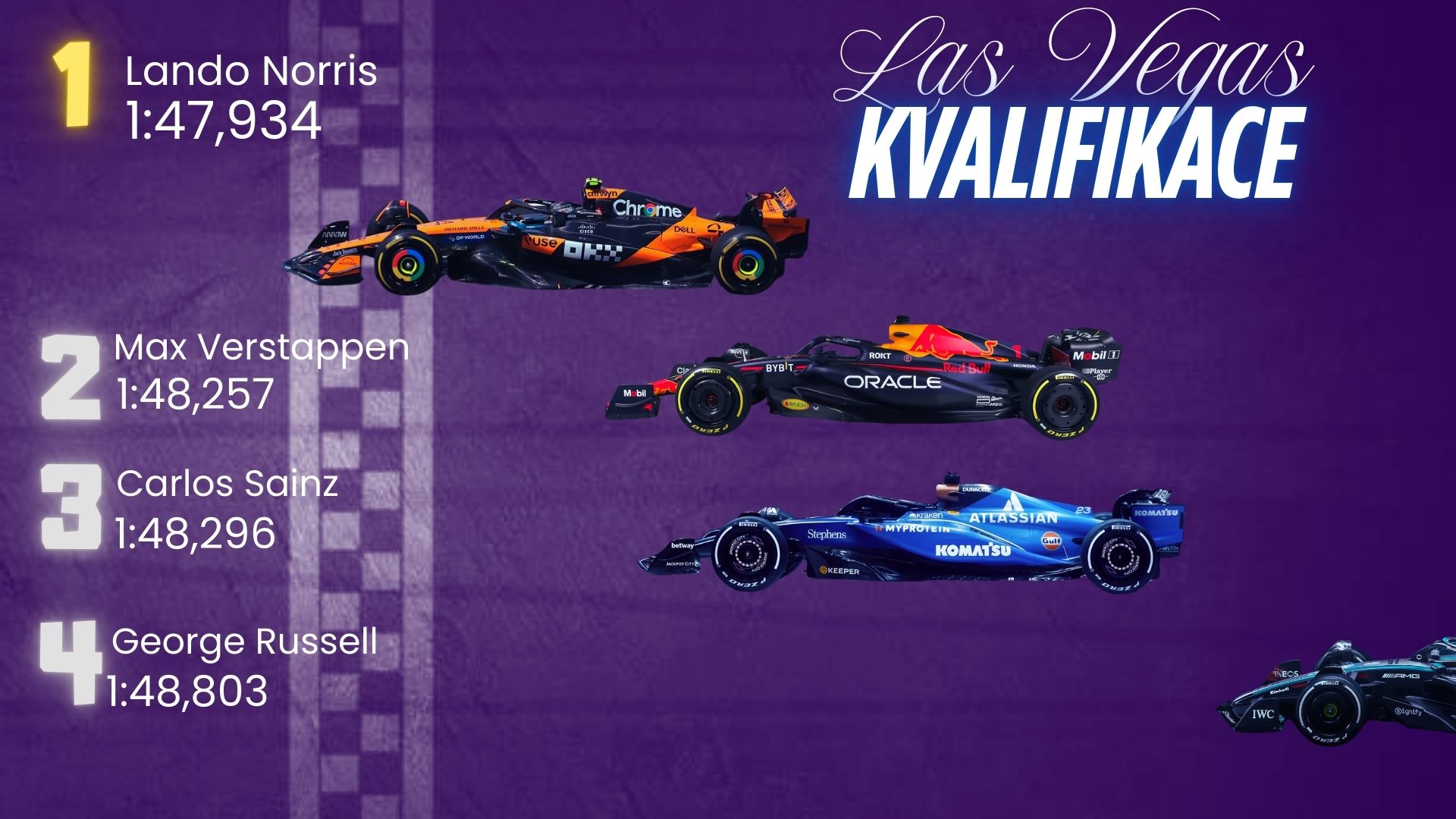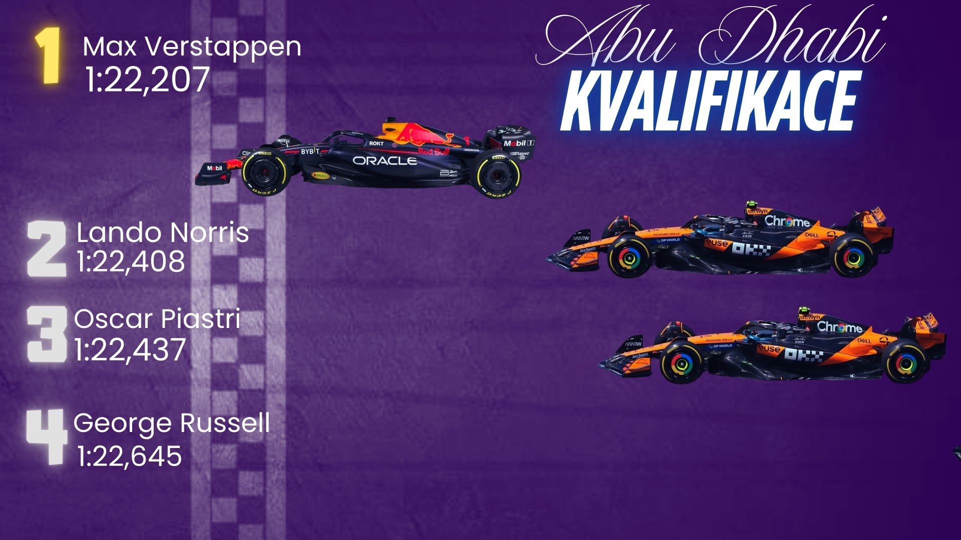 Mamé za sebou poslední kvalifikaci této sezony. Nejpřízniveji dopadla pro Maxe Verstappena, ale ani McLareny nemusí smutnit, zejména Lando Norris. Je možné že nás zítra čeká týmová režie. Russell chyboval v poslední zatáčce. Leclerc z jeho Ferrari vymačkal i to, co tam nebylo.